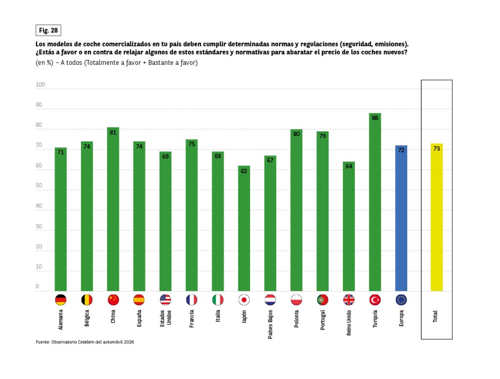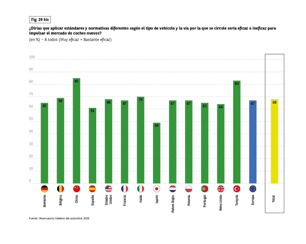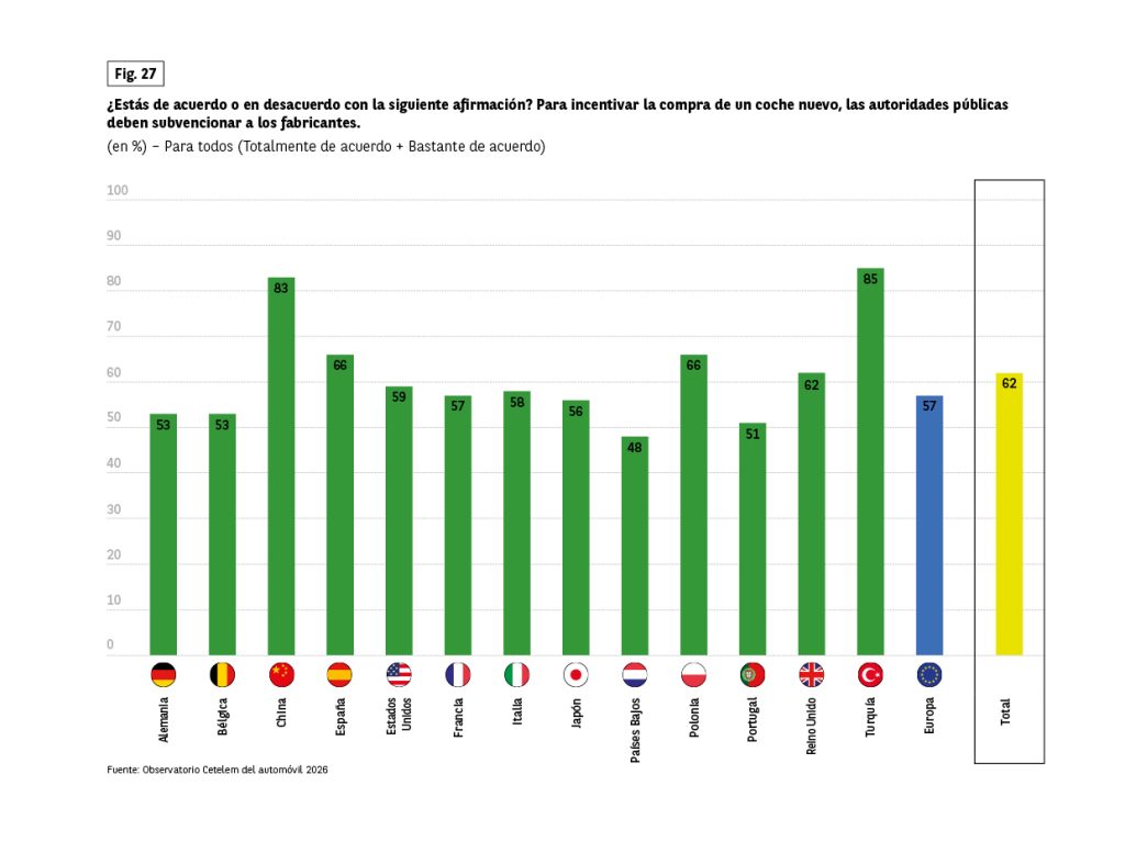 Sin embargo, en algunos aspectos ligados a la dimensión económica, los conductores muestran posturas muy definidas. Es el caso de los incentivos a la compra, que han sido muy bien recibidos (Fig. 24). Casi 8 de cada 10 encuestados están a favor. Una vez más, los japoneses se muestran más reservados (61%), frente a turcos y chinos, claramente favorables.
