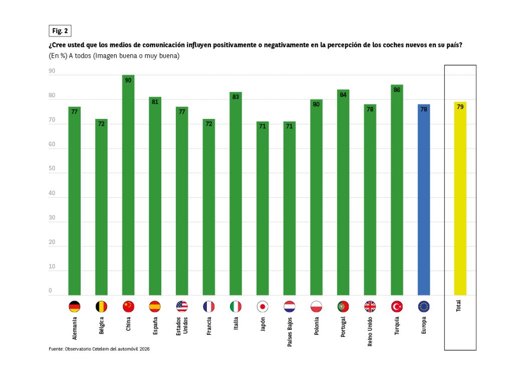 Los encuestados creen que los medios de comunicación transmiten eficazmente esta imagen positiva. (Fig. 2). El 81% de los españoles comparte esta opinión, ligeramente por encima de la media global de países analizados que se sitúa en el 79%. En China, el resultado es aún más impresionante, con un 90 % de opiniones positivas. Alemania y Estados Unidos mostraron resultados ligeramente más bajos (77%).