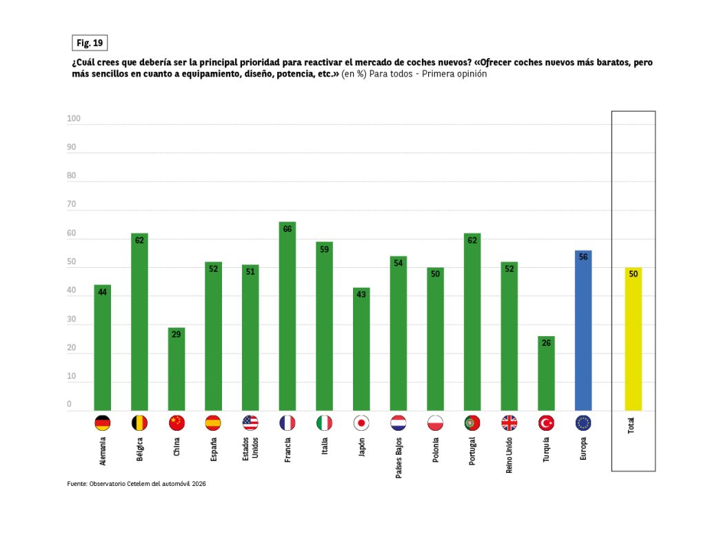 Para 1 de cada 2 encuestados, fabricar coches más baratos y sencillos es una prioridad para reactivar el mercado (Fig. 19). Esta opinión es especialmente fuerte en Francia, mientras que es menos compartida en Turquía, China y Alemania, países tradicionalmente asociados a berlinas y SUV de gama alta.