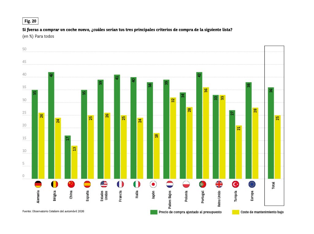 Salvo en Japón, China y Polonia, el precio ocupa siempre el primer lugar. La atención al coste de mantenimiento es especialmente elevada en Polonia, Países Bajos y Reino Unido.