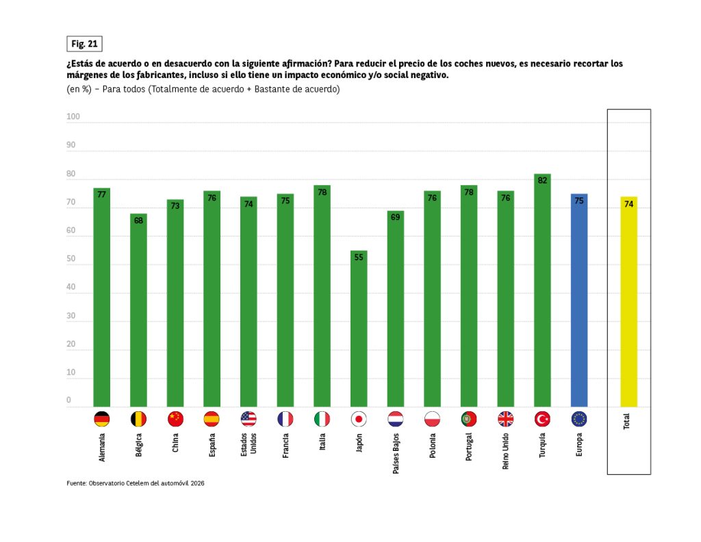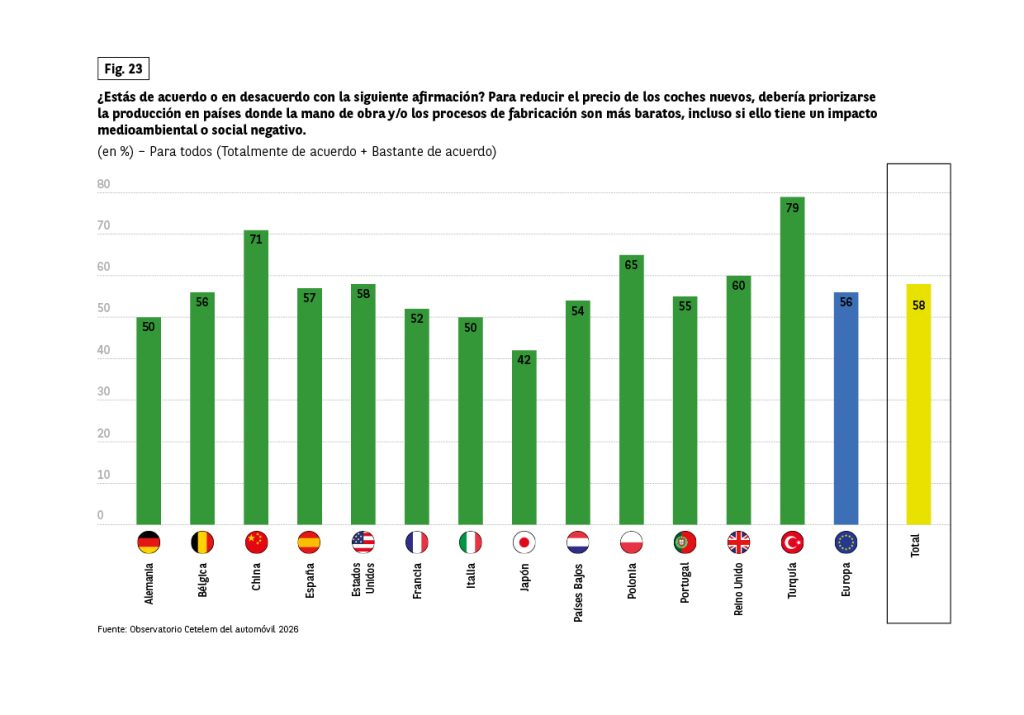 Otra vía para reducir el precio de los coches pasa por fabricarlos en países donde la mano de obra es más barata, incluso si ello implica un impacto social o medioambiental negativo. 6 de cada 10 encuestados se muestran a favor de esta idea. En este sentido, China, Turquía y, en menor medida, Polonia destacan como los países más favorables, precisamente los tres donde los costes laborales son más bajos. Japón es el país más comprometido con la producción nacional, con solo un 42% de apoyo.