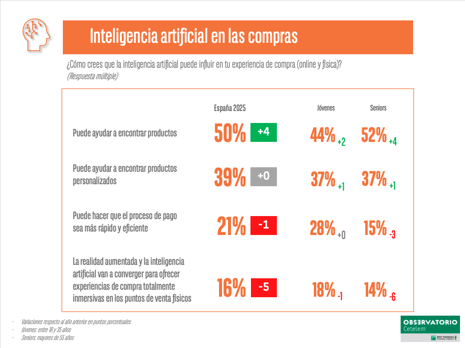 Un 39% opina que esta nueva tecnología les puede ayudar a encontrar productos personalizados, porcentaje que se mantiene estable respecto a 2024.