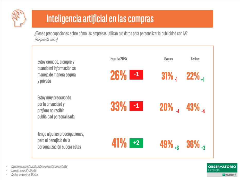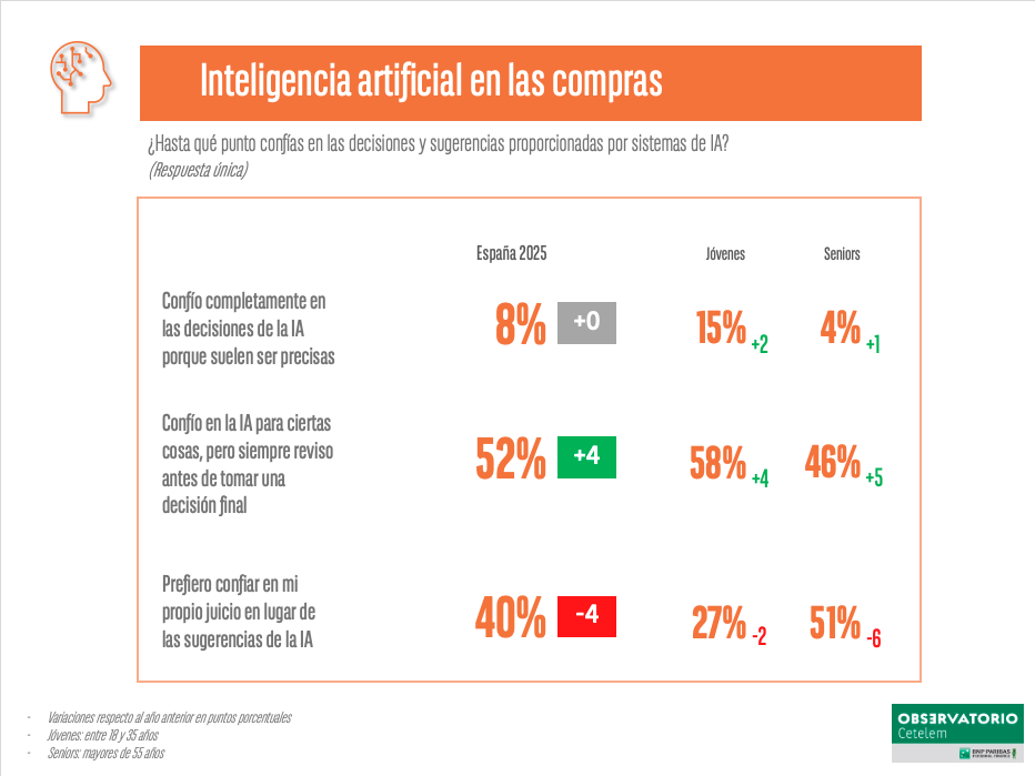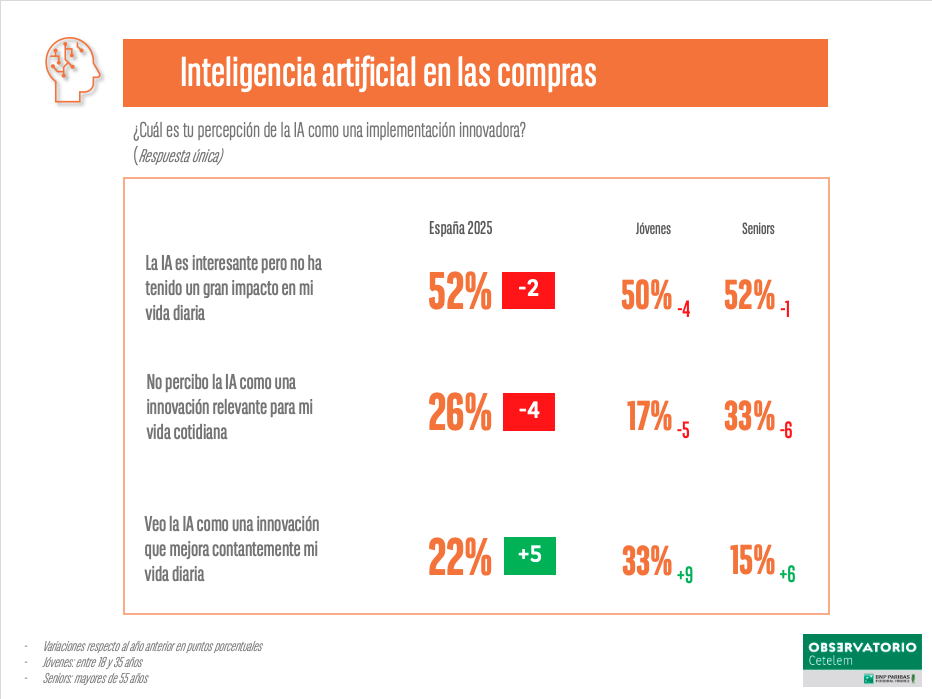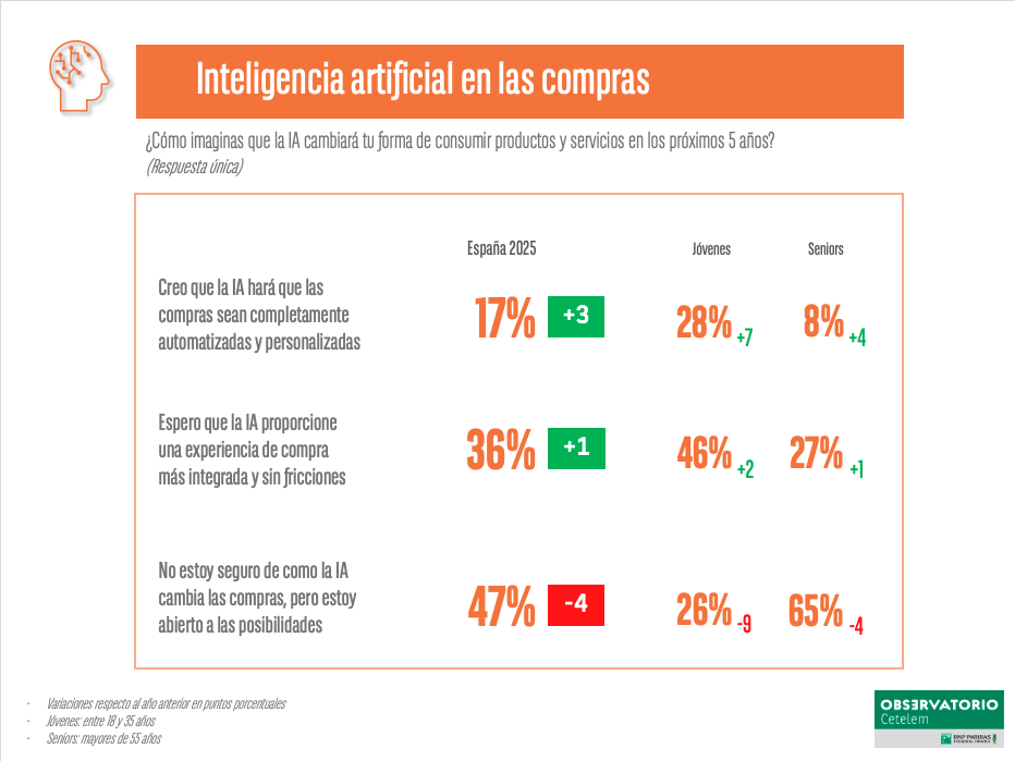 Prácticamente la mitad de los consumidores españoles (47%) no está seguro de como la inteligencia artificial afectará de aquí a cinco años en su forma de consumir, aunque se muestra abierto a las posibilidades que esta les ofrezca, porcentaje que desciende 4 puntos respecto al 2024. En este sentido los seniors destacan claramente por encima de la media con un 65% de menciones.