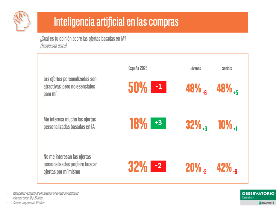 El 18% declara que le interesa mucho las ofertas personalizadas basadas en IA, mostrando un aumento de +3pp respecto al año anterior. Los jóvenes destacan por encima de la media en 14pp.
