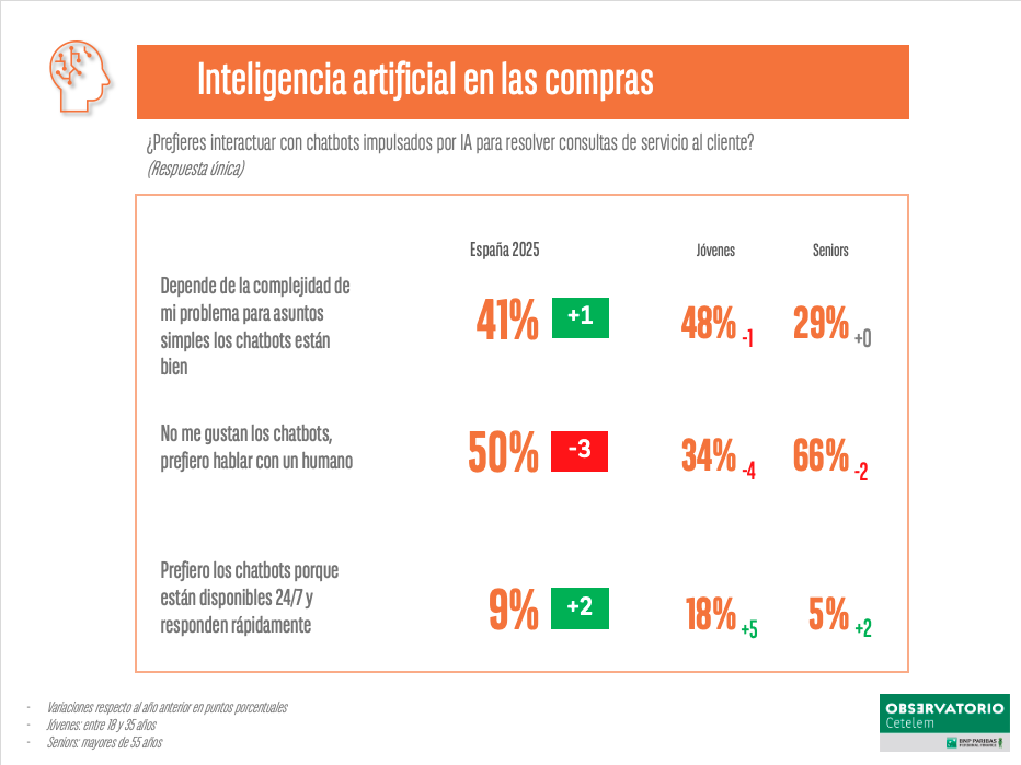 Aunque sólo el 9% prefiere los chatbots porque están disponibles 24 horas y responden rápidamente, este porcentaje crece dos puntos respecto a 2024, destacando 9pp por encima de la media los jóvenes con un 18% de menciones