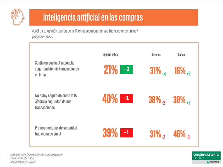Pero la realidad, es que la gran mayoría de consumidores no tiene claro que la inteligencia artificial pueda mejorar la seguridad de las transacciones. El 40% afirma que no está seguro de como la IA puede afectar de manera positiva y otro 39% afirma que prefiere los métodos de seguridad tradicionales, aunque en ambos casos con ligeros descensos respecto al año anterior.