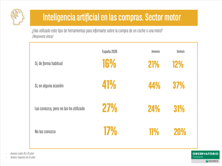 La Inteligencia artificial ha supuesto un avance en lo que respecta a las consultas de información en el proceso de compra de los consumidores. En el caso de la compra relacionada con el sector del motor, como la compra de un coche o una moto, el 41% de los conductores encuestados afirma haber utilizado la IA en alguna ocasión, y un 16% declara utilizarla de manera habitual. Los jóvenes destacan por encima de la media en 5pp con un 21% de menciones.