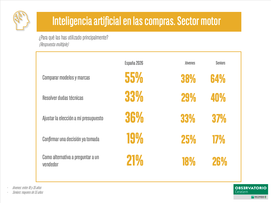 Entre aquellos conductores que han utilizado la IA en su proceso de compra de coche o moto, el uso más habitual es para comparar modelos y marcas (55%), seguido de los que la utilizan para ajustar la elección de su compra a su presupuesto (36%), y los que recurren a estas herramientas para resolver dudas técnicas (33%), este sería el Top 3 del ranking.