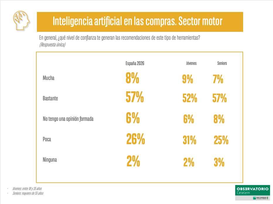 En lo que respecta a la confianza que le generan a los consumidores del sector motor las recomendaciones de este tipo de herramientas, el 65% declara tener mucha o bastante confianza, sin diferencias significativas en cuanto a la comparación entre jóvenes y seniors, aunque estos últimos presentan un porcentaje ligeramente superior (64% vs 62%), y en ambos casos se sitúan ligeramente por debajo de la media.