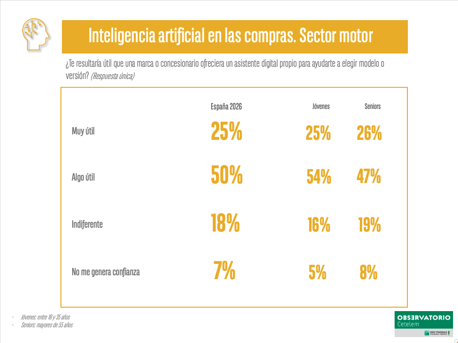 El 75% de los españoles encuestados declara que le resultaría útil o muy útil que una marca o concesionario  de coche o moto, ofreciera un asistente digital propio para ayudarte a elegir modelo o versión, destacando ligeramente por encima de la media los más jóvenes con un 79% de menciones, y también por encima de los seniors (73%).