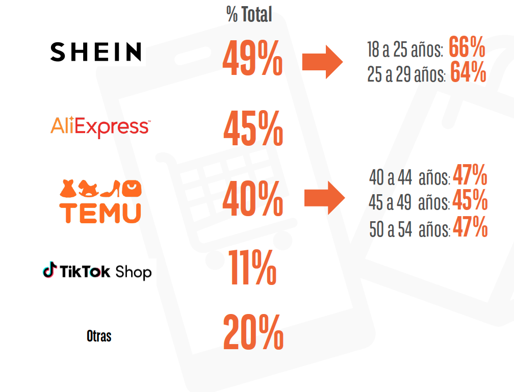 Temu por su parte, es más utilizada por aquellos consumidores con edades entre los 40 y 54 años con porcentajes superiores al 45%.