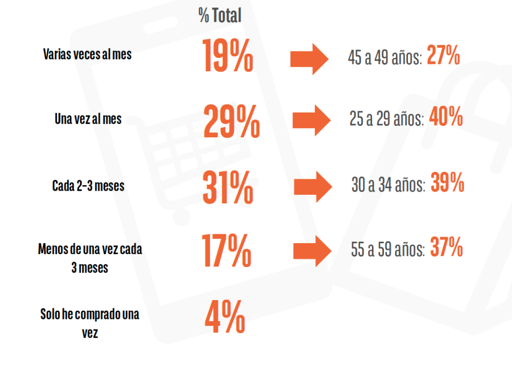 Respecto a la frecuencia de compras online en este tipo de plataformas, los porcentajes más elevados son el 31% que afirma comprar cada 2 o 3 meses, destacando los consumidores entre los 30 y 34 años (39%) y el 29% que declara realizar compras una vez al mes, siendo aquellos entre los 25 Y 29 años los más asiduos con un 40% de menciones.