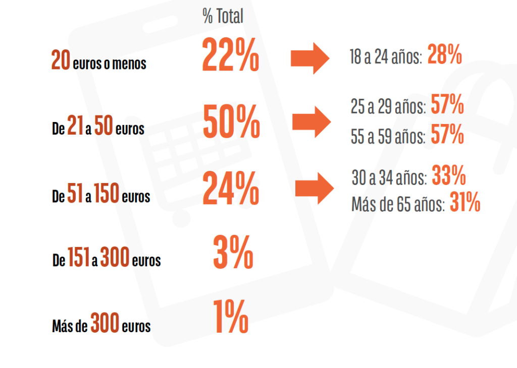 En tercer lugar, y con un porcentaje del 22% se situán las compras de menos de 20€, destacando por encima de la media los consumidores más jóvenes entre los 18 y 24 años con un 28% de menciones.