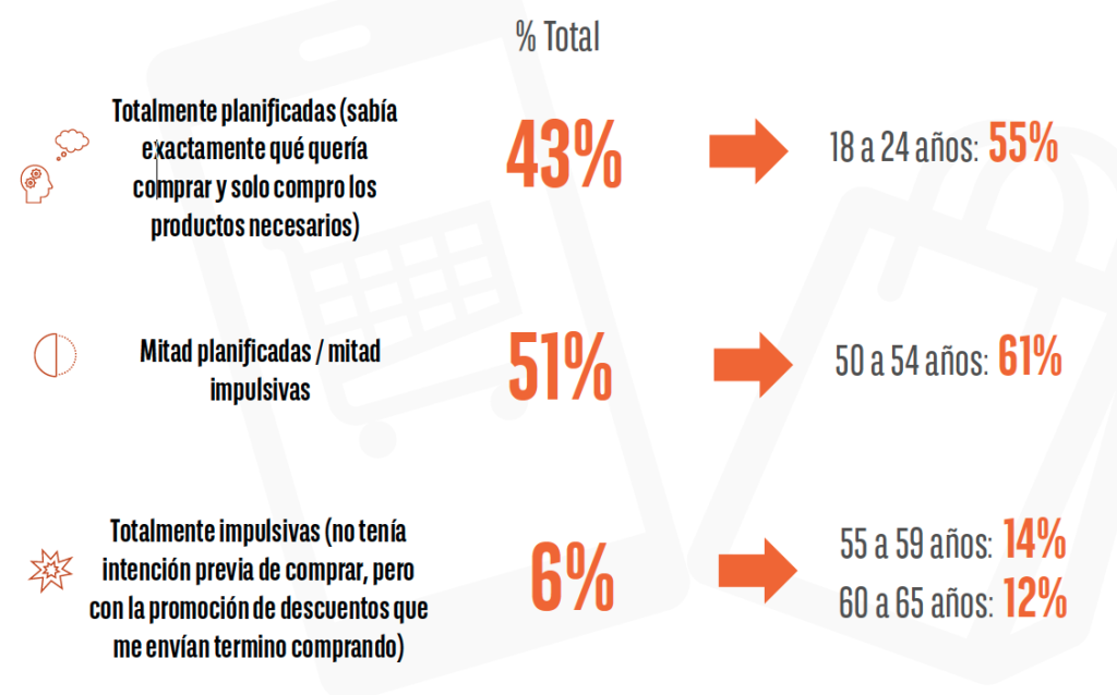 Sólo un 6% declara realizar compras totalmente impulsivas que no tenía planificadas al recibir los descuentos. Los más impulsivos son los consumidores más mayores, aquellos con edades entre los 55 y 59 años con un 14% de menciones, y aquellos entre los 60 y 65 años con un 12%.