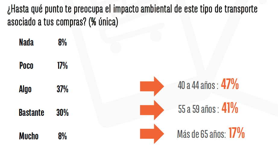 Respecto a la preocupación que les genera el impacto ambiental de este tipo de transporte asociado a sus compras, el porcentaje más alto lo encontramos en aquellos que responden que les preocupa algo con un 37% de menciones. Sólo el 8% afirma que les preocupa mucho, destacando sobre todo los mayores de 65 años con un 17%.