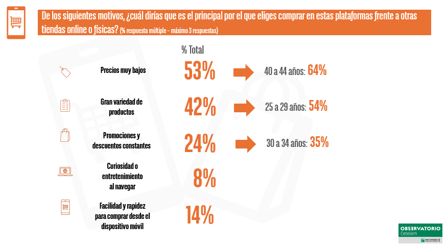 El motivo principal de compra son los precios bajos (53%), pero muy unido a la gran variedad de productos que ofrecen este tipo de plataformas (42%). Los que más destacan por encima de la media en la valoración del precio, son aquellos compradores entre los 40 y 44 años con un 64% (+11 pp vs la media )de menciones. En el caso de la variedad de productos, encontramos a un perfil más jóven entre los 25 y 29 años con un 54% (+12 pp vs la media).