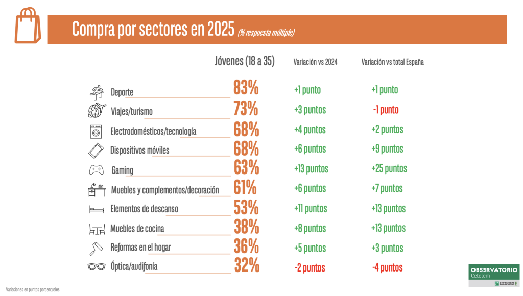 El consumo de los jóvenes en 2025 presenta un crecimiento generalizado, con una evolución clara en la forma de comprar, situando a este colectivo como uno de los principales motores del consumo durante este año. Los sectores deportes, electrodomésticos, dispositivos móviles, gaming y muebles conforman el top 5 de productos más comprados por los jóvenes, así lo revela el último estudio de actualidad; “El consumo en los jóvenes en 2025”, elaborado por el Observatorio Cetelem.
