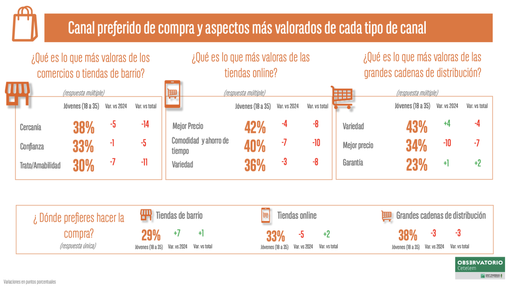 En el caso de las grandes cadenas de distribución, los jóvenes valoran principalmente la variedad, con un 43%, el mejor precio, con un 34%, y la garantía, con un 23%. Este último aspecto muestra un notable incremento de 14 puntos porcentuales respecto a 2024, mientras que la valoración del precio cae 20 puntos porcentuales. En comparación con la media de españoles, los jóvenes se sitúan muy por debajo en la valoración del precio, con 13 puntos porcentuales menos, y en la posibilidad de realizar toda la compra en el mismo establecimiento, con 14 puntos porcentuales menos.