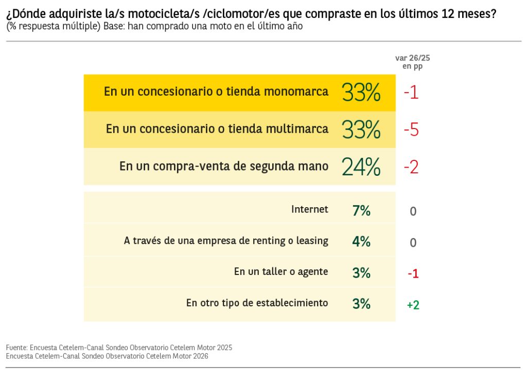 En cuanto al tipo de establecimiento donde adquirieron su moto, el 33% de los encuestados nos dice que la ha comprado en un concesionario o tienda multimarca (descendiendo en 5 puntos porcentuales), junto a otro 33% que lo ha hecho en un concesionario monomarca. En tercer lugar, con un 24%, encontramos a los consumidores que han comprado su moto en un compraventa de segunda mano, cayendo en 2 puntos respecto al año anterior.