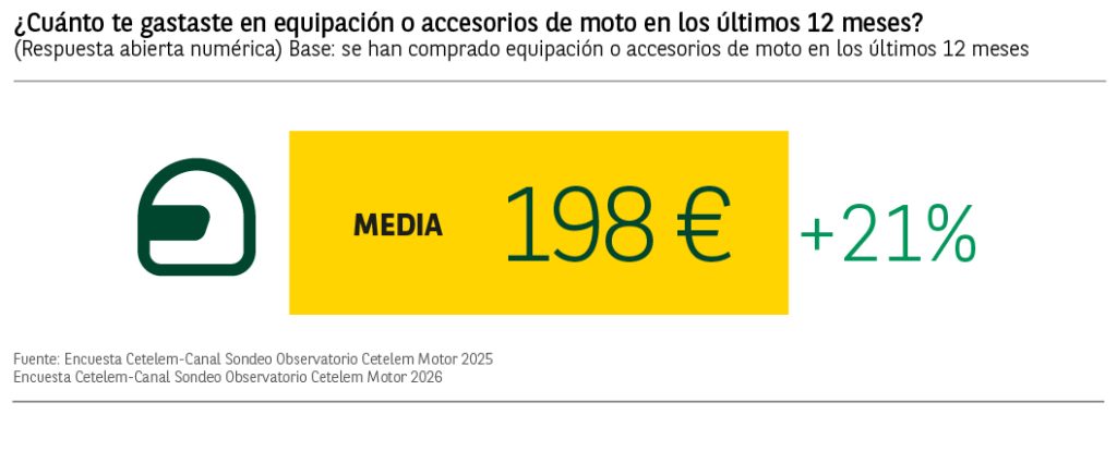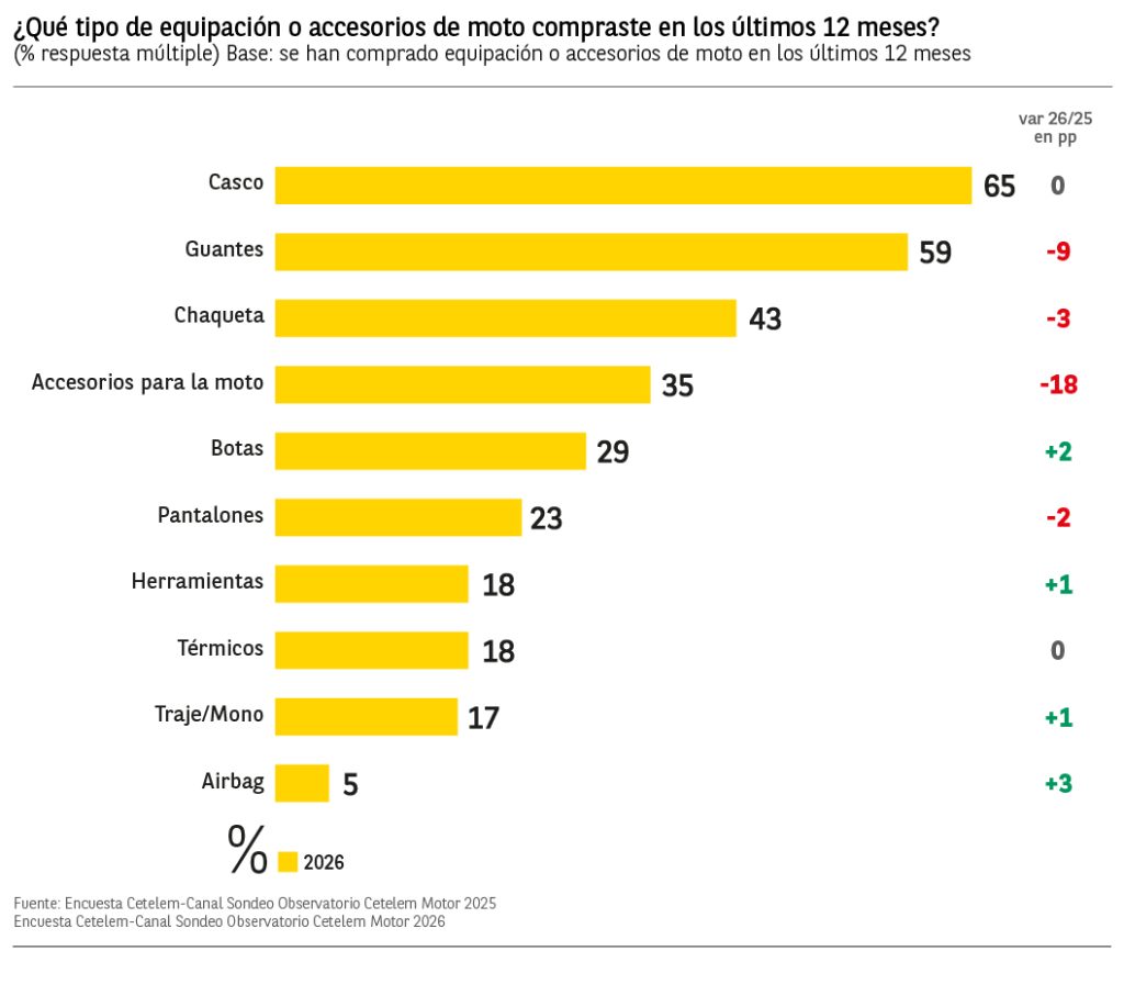El 52% de los consumidores que tienen o pretenden comprar una moto en los próximos 2 años, afirma haber comprado accesorios para la moto en los últimos 12 meses, lo que supone un descenso respecto al año anterior de 7 puntos porcentuales. Son los conductores de entre los 45 y 54 años los que destacan por encima de la media en la compra de accesorios con un 58% de menciones.