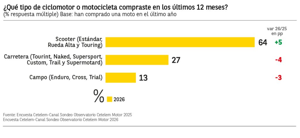 Entre los conductores encuestados que compraron su moto durante el último año, el 64% adquirieron una moto tipo Scooter, con un aumento de 5 puntos porcentuales respecto a 2025. Los conductores mayores de 55 años son los que más se animaron a comprar este tipo de motos con un 79% de menciones.