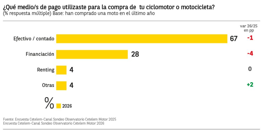 El medio de pago más utilizado por los compradores de ciclomotor o motocicleta ha vuelto a ser el pago en efectivo con un 67% de menciones. El 28% optó por la financiación, destacando los encuestados de 25 a 34 años con un 42% de menciones.