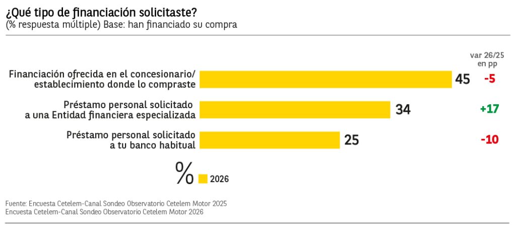 Entre aquellos que financiaron, destacar que el tipo de financiación más solicitada fue la ofrecida en el concesionario con un 45% de menciones frente al 50% del año anterior, mostrando un ligero descenso de 5 puntos porcentuales. El crédito demandado a una entidad financiera especializada aumenta de un 17% a un 34%.