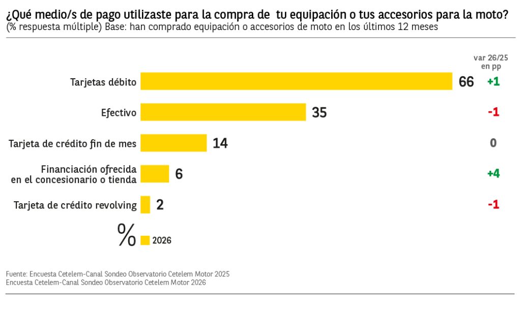 Por otro lado, el medio de pago más utilizado a la hora de comprar accesorios para la moto ha sido el pago mediante tarjeta de débito con el 66% de las menciones. El pago en efectivo es el siguiente en el ranking con un 35% de declaraciones, descendiendo en un punto respecto al año anterior.