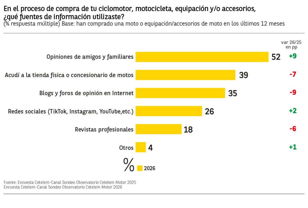 En cuanto al tipo de tienda, el 54% de los que han comprado accesorios de moto afirma haberlos adquirido en un concesionario o tienda física multimarca. El siguiente canal de compra preferido por los consumidores es internet con un 29% de menciones, descendiendo 10 puntos respecto al año anterior.