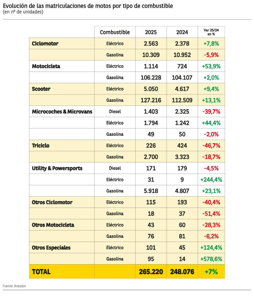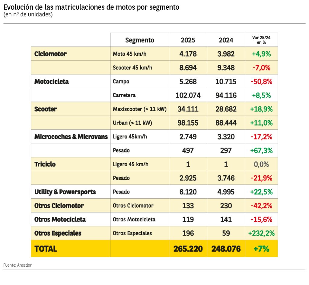 El mercado total de motos en 2025 (incluyendo otros vehículos ligeros) alcanzó las 265.200 matriculaciones con un aumento del 7% respecto a 2024. Se aprecia un significativo aumento en la matriculación de los vehículos eléctricos y en el segmento del scooter.