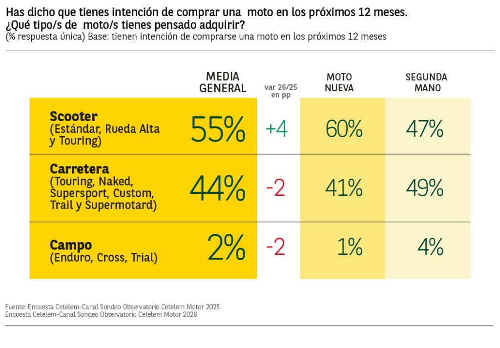 Centrándonos en el tipo de moto, encontramos a los que prefieren las scooters como primera opción con el 55% de las menciones (4 puntos porcentuales por encima de la intención del año anterior), opción preferida por los usuarios de 35 a 44 años con un 90% de menciones. De cerca aparecen las motos de carretera con un 44%, descendiendo en 2 puntos respecto a la intención mostrada en 2025, y siendo las preferidas por los de 18 a 34 años. Por último, optarán por las motos de campo el 2% de los usuarios, cayendo este porcentaje de intención de compra en 2 puntos respecto al año anterior.
