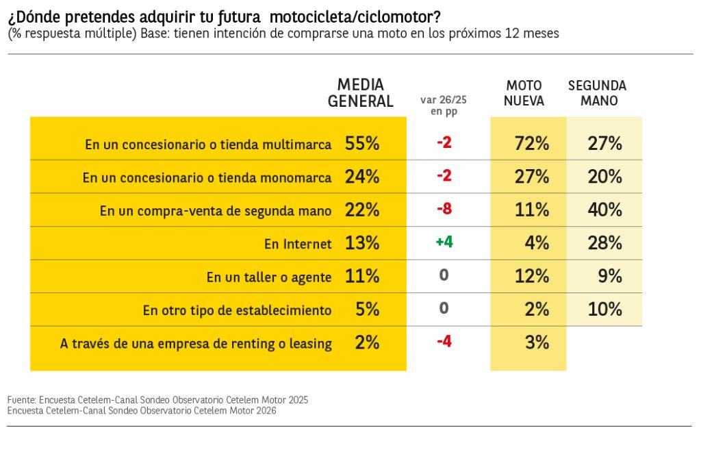 El 55% de los usuarios pretende adquirir su próxima moto en un concesionario o tienda multimarca, destacando muy por encima de la media los usuarios de 45 a 54 años con un 64% de menciones. Aumentan respecto al año anterior los porcentajes de conductores que pretenden comprar su moto en internet.