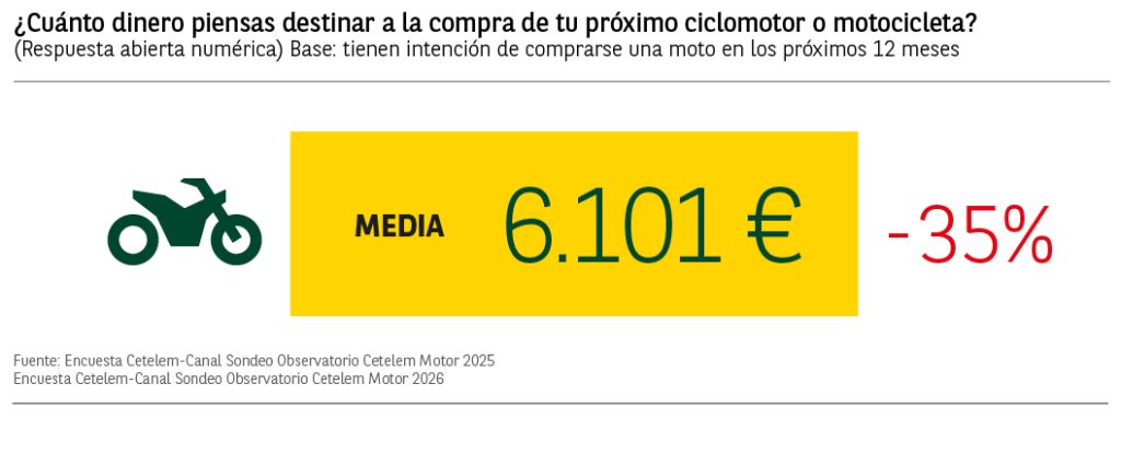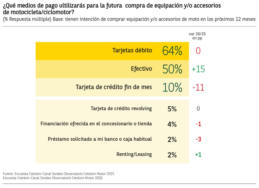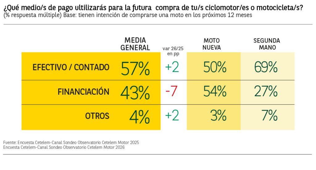 En cuanto al medio de pago, el pago en efectivo será el más utilizado, concretamente por el 57% de los futuros compradores de motos (aumentando en 2 puntos), seguido por los usuarios que optarán por la financiación, que aparecen con un 43%, descendiendo en 7 puntos porcentuales respecto al año anterior.