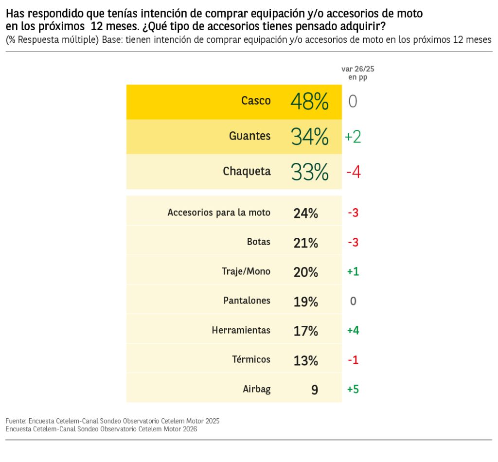 En cuanto a lo que tiene pensado comprar, los cascos con el 48% de las menciones, se encuentran en el primer lugar, seguido por los guantes con un 34%, y por las chaquetas con un 33%. Aumentan las intenciones de compra en las categorías de airbags, herramientas, guantes y trajes/monos.