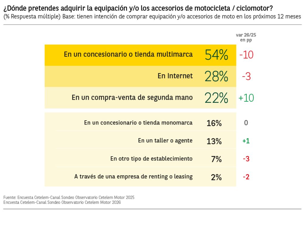 Si observamos el futuro lugar de compra de los accesorios de moto, los concesionarios o tiendas multimarca volverán a ser los favoritos para el consumidor, el 54% de los conductores así lo indica. De lejos con el 28% encontramos las tiendas online y por detrás con un 22% las tiendas de segunda mano.