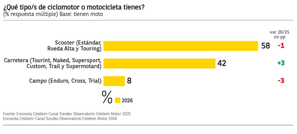 El 58% de los españoles encuestados que poseen actualmente una motocicleta o un ciclomotor, dice tener una moto tipo Scooter (destacan por encima de la media los conductores de 45 a 54 años con un 73%), seguidos del 42% que afirma tener una moto de carretera y por último el 8% que posee motos de campo. Este año aumentan los conductores de motos de carretera en detrimento de los conductores de motos de campo.