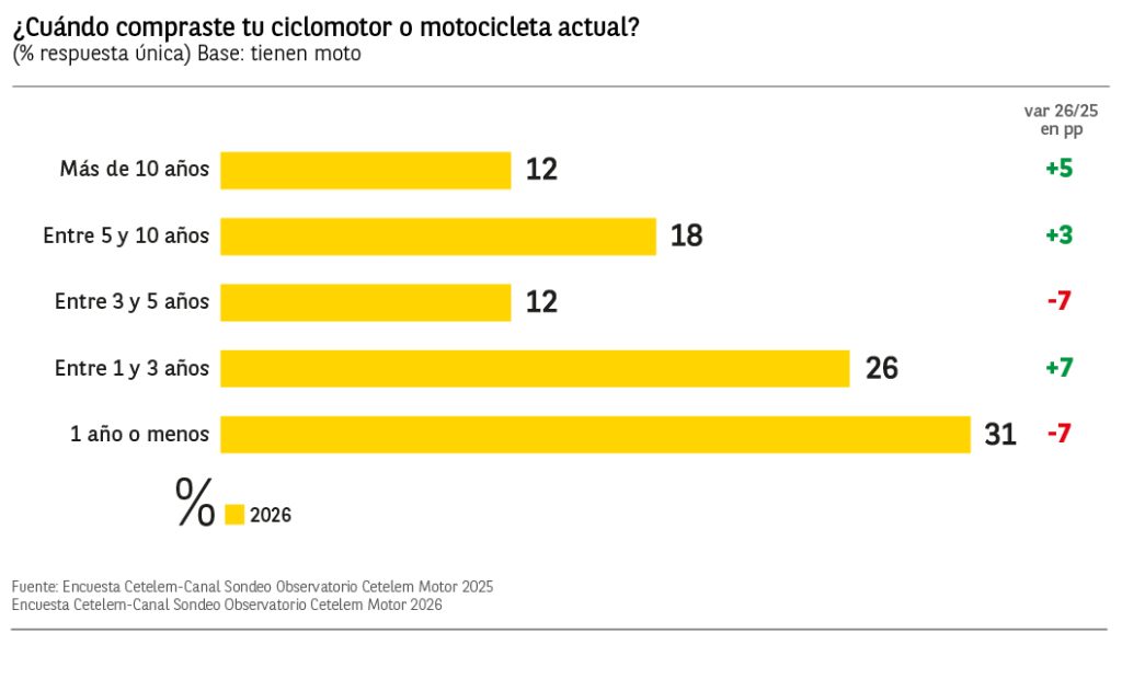 El 26% (+7 puntos respecto al año anterior) de los conductores españoles encuestados afirma haber comprado su moto entre hace 1 y 3 años (los más jóvenes de 18 a 25 años están por encima de la media un 44% de menciones). El 31% afirma haberla comprado en el último año, con un descenso de 7 puntos porcentuales respecto a 2025. Es importante señalar el aumento de 5 puntos porcentuales en el porcentaje de los que dicen tener una moto de más de 10 años, alcanzando el 12% y destacando entre ellos los conductores mayores de 55 años.